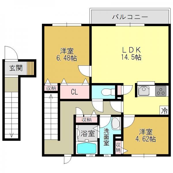 | 種別 / 構造 | ハイツ / 軽量鉄骨造 | 主要採光面 | 南 | 所在階 / 階数 | 2階 / 2階 |